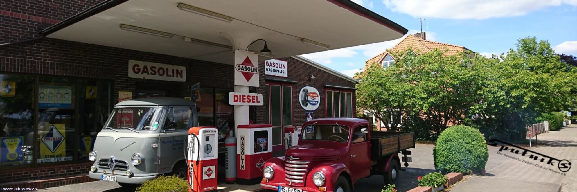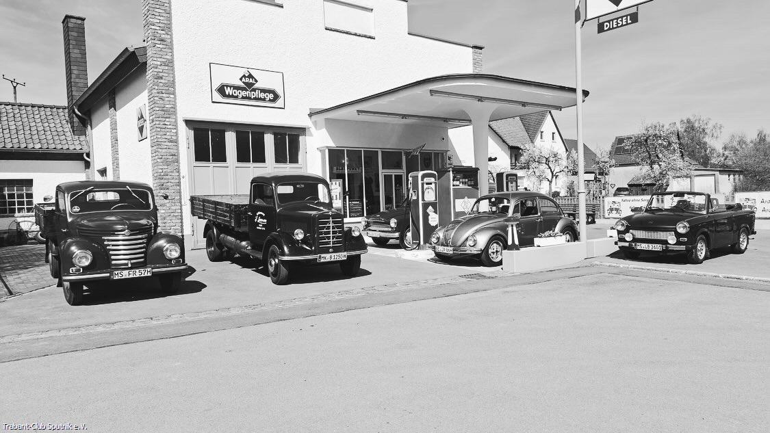 Bei bestem Frühlingswetter ging es heute ins Sauerland. Die Jahresanfahrt führte uns nach Neuenrade zu einer Retro Araltankstelle aus den 50er/60er Jahren. Familie Levermann begrüßte uns herzlich. Zunächst zeigte Frank Levermann uns seine nachgebaute Tankstelle mit Zapfsäulen und Laden. Danach ging es in die Werkstatt. Dort wurden uns alte Autos der Marke Hansa Lloyd und Borgward gezeigt. Auf der Hebebühne stand der zu restaurierende Borgward Hansa 1500 (Vorgänger der Borgward Isabella). In einem weiteren Raum befanden sich eine Esse und Maschinen, die mit Transmissionsriemen angetrieben werden, wie z.B. eine Standbohrmaschine – und (fast) alles funktionstüchtig. Weiter ging es in die große Garage.weiterlesen...