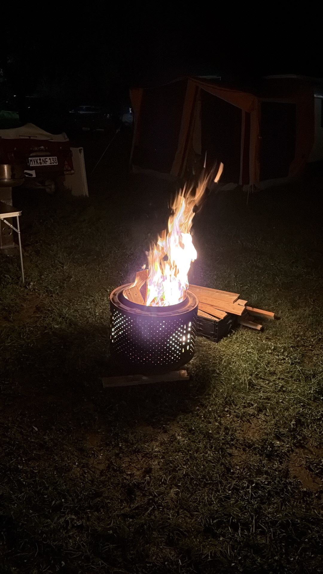 Zum Glück hatten wir unsere Autos tagsüber auf einen ruhigeren Platz umgestellt, sodass wir den Abend entspannt an der Feuertonne ausklingen lassen konnten – ganz ohne Lärm, dafür mit viel Gemütlichkeit.